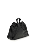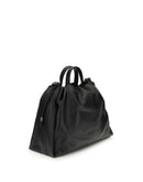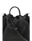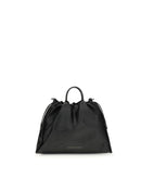 Leather Shoulder Bag by Brunello Cucinelli featuring two flat top handles, drawstring closure, adjustable and removable shoulder strap, single compartment, iconic brand monogram press-stamped on front, monochrome pattern.