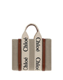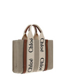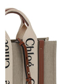 Canvas Woody Handbag by Chloé, two flat top handles, removable and adjustable flat leather shoulder strap, bands on front and back with contrasting iconic brand monogram, interior flat pocket, leather trim.