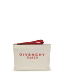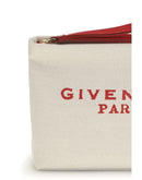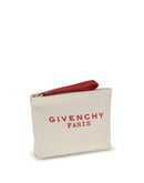 The Canvas Pochette by Givenchy features a zip closure and a grosgrain shoulder strap lined with leather for optimal comfort. The front displays the GIVENCHY Paris logo, with a matching application inside. The pochette includes a main compartment and a flat inner pocket, combining functionality and style in a refined design.