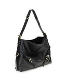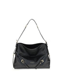 Givenchy’s Voyou Shoulder Bag medium features a soft V-shaped silhouette and generous volume. The adjustable shoulder strap allows it to be carried by hand, shoulder or crossbody, ensuring maximum versatility. The GIVENCHY signature is stamped on both the front and top of the bag, while engraved metal clasps and gold-tone finish details complete the design with elegance.