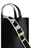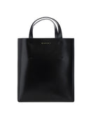 Calfskin Museo Handbag by Marni, iconic brand monogram printed in contrast on front, two flat handles for carrying it by hand, removable and adjustable flat monogrammed shoulder strap, single interior compartment, interior slit pocket, cotton lining.