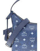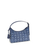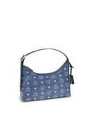 Aren Hobo Shoulder Bag by MCM, adjustable flat shoulder strap, zippered top closure, interior zippered welt pocket, single compartment, hammered weave, iconic brand monogram printed with all-over contrasting pressure print, padlock detail.