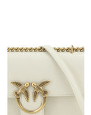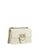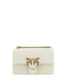 Calfskin Love One Mini Shoulder Bag by Pinko, featuring front flap closure with magnetic button, iconic silver-plated Love Birds logo embossed on front, dual interior compartment, sliding chain strap, iconic tone-on-tone embroidered brand monogram on back, adjustable and removable flat leather shoulder strap.