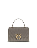 Calfskin Love Lady Handbag by Pinko, magnetic flap front closure, iconic gold-plated Love Birds logo embossed on the front, quilted and padded design, double interior compartment, removable chain shoulder strap with smooth leather insert, flat rigid top handle, interior flat pocket with zipper, iconic tone-on-tone embroidered brand monogram on the back.