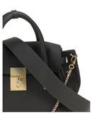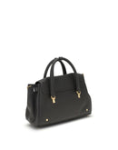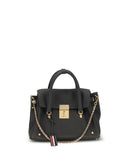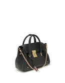 The Mrs. Thom Handbag by Thom Browne is an elegant expression of the house’s distinctive style. Crafted in fine pebble-grained leather, it features the iconic grosgrain striped loop at the back. The front closure is embellished with a brass padlock, while the ribbon shoulder strap and top handles offer versatility of use. Inside, a zippered pocket ensures functionality, complemented by brass rivets and feet that protect the base and add a refined touch.