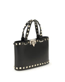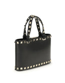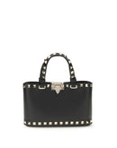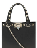 The Mini Shopping Rockstud by Valentino Garavani is crafted from grained calfskin and can be worn on the shoulder, cross-body, or carried by hand thanks to its handles and removable chain. It is adorned with studs and metal parts in a platinum finish and features a hook closure. The nappa lining and interior with two card slots complete this versatile and refined bag.