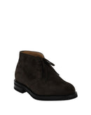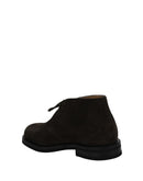 Calfskin Lace-Up Shoes by Church’s, an ankle-length design, extended toe, lace-up front closure, slight leather block heel, suede leather design, press-on logo insole.