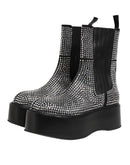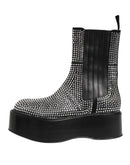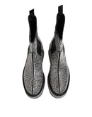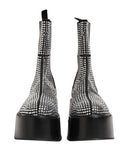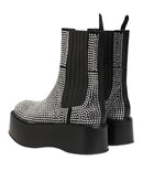 mid-calf boots, crafted in sleek black and adorned with dazzling crystal strass embellishments. The refined silhouette balances glamor and elegance, making them perfect for evening looks or adding a touch of sparkle to day-to-night ensembles. A statement piece for any luxury wardrobe.