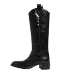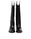 boots feature a sleek black finish. Designed with an over-the-calf silhouette, they offer a striking style statement while providing a comfortable fit. Perfect for pairing with skirts, dresses, or slim trousers for an effortlessly chic ensemble.