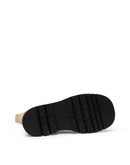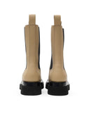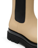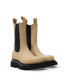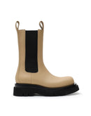 Beige and Black Leather Lug Ankle Boots by Bottega Veneta. Maxi black lug sole, round toe, brushed leather, contrasting elastic side bands, and shoehorn tabs on the front and back for comfortable wear.