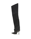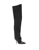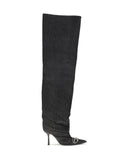 The Venus high Boots by Diesel combine bold character and contemporary style. Made of black denim with a coated wash, they stand out with a wide, slightly gathered shaft that wraps around the leg to the thigh. The tapered toe and 9 cm stiletto heel slender the figure, while the iconic metal Oval D detail adds a distinctive and recognizable touch. Perfect for punchy, impactful looks.