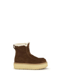The suede and shearling Ankle Boots by Prada combine comfort and sophistication in a design designed for the winter season. Made of suede leather with a soft sheepskin interior, they offer warmth and softness, while the rubber sole ensures lightness and durability. The triangular enameled metal logo adds a distinctive touch, complemented by a sheepskin-lined removable footbed for ultimate comfort.