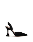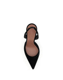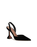 The velvet pointed toe high heel slingback Pumps by Amina Muaddi feature a velvet finish for a luxurious touch and a pointed toe that elongates the silhouette. The signature sculpted heel adds modern elegance, while the slingback strap ensures a refined and comfortable fit.