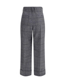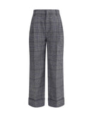 Brunello Cucinelli’s Prince of Wales patterned pants interpret classic elegance with a modern cut. The front zip-and-hook closure and belt loops at the waist ensure a tailored fit, while side and back welt pockets add functionality. The turn-up at the bottom and cropped wide leg give the garment a contemporary touch, perfect for a sophisticated yet casual style.