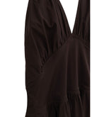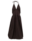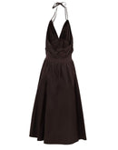 In brown cotton, crossover top, waistband, very wide skirt part, side slit. On the back, open back, zip closure.