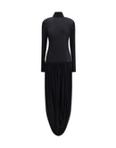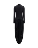 Magda Butrym’s long turtleneck Dress is a sophisticated and feminine piece, featuring long sleeves and a wrap silhouette. The low waist blends harmoniously with the draped skirt, creating an elegant and flowing effect, perfect for special occasions or refined looks.