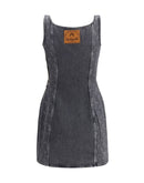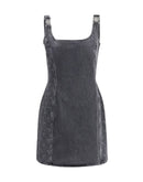 The Moon Laser Denim Sleeveless Mini Dress By Marine Serre embodies a bold, structured aesthetic. The fitted silhouette is framed by a square neckline and gold buckle straps that lend a striking, modern edge. Along the side panels, the signature laser Moon print creates a distinctive graphic contrast against the grey-wash denim. A sleek side zipper ensures ease, while the Marine Serre leather patch completes the piece with the brand’s unmistakable identity.