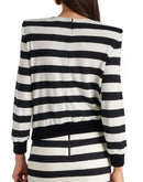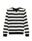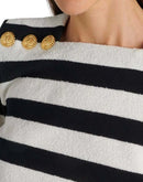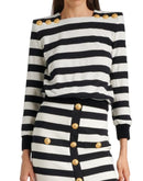 – Composition: 49% Acrylic 30% Cotton 21% Polyamide – Long sleeves – Hand wash – Square neck – Straight hem – Shoulder pads – Knitted construction – Back invisible zip closure – Embossed gold-tone buttons – Horizontal stripe pattern – Made in France – Gender: WOMEN –
