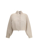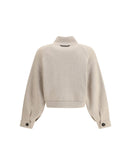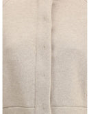 The Cashmere Cardigan by Brunello Cucinelli features a combined button and zipper closure, long sleeves with buttoned cuffs, and two welt pockets at the front, combining functionality with contemporary style.