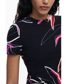 Exude an eclectic charm with this Desigual ‘Lala’ T-shirt. Designed for the bold and the fearless, it’s the perfect blend of comfort and statement style. Flaunt Desigual’s signature print with pride, as the eye-catching logo takes center stage against the timeless black backdrop. With a snug crew neck and the ease of short sleeves, this T-shirt is crafted from a luxuriously soft mixture of elastane and viscose, ensuring a flattering fit that’s as comfortable as it is stylish. Made with love in India, it’s an essential addition to your wardrobe that speaks volumes of your unique fashion sense.