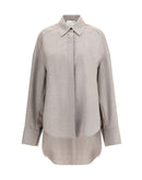 Di Stavnister’s Heidi Shirt is a contemporary design that combines soft lines and tailored details. Featuring a classic collar and dropped shoulders, it has a front button closure and an asymmetrical hem that adds movement and originality to the design.