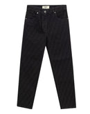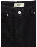 Black Fendi Logo Jacquard Jeans. In Black Cotton, five pockets, button and covered zipper closure, on back leather tag with engraved logo. Tone-on-tone allover logo printed all over the pants. Slim fit.
