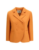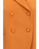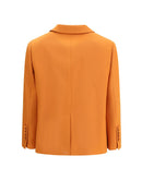 The grain de poudre wool Jacket by Fendi is a short double-breasted piece featuring an elegant notched lapel and 3/4 sleeves that give the silhouette a modern, refined appeal. Horizontal welt pockets enhance the clean lines, while the tone-on-tone covered button closure ensures a polished, cohesive look. Fully lined and crafted from grain de poudre wool in orange, it embodies tailored sophistication with a bold personality.