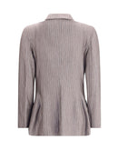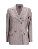 Giorgio Armani’s Double-breasted Blazer is crafted from a fine cashmere and silk striped jersey, combining elegance and comfort. Featuring peaked lapels and a four-button double-breasted closure, it has two small patch pockets on the chest and two wing pockets on the front for a sophisticated and timeless look.