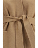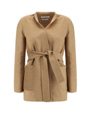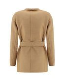 The Harold Jacket by Max Mara is crafted from pure camel double drap, finished with tailored topstitching for a refined look. This unstructured robe-style design features patch pockets, long sleeves, an unlined construction, and a removable belt that enhances the figure with understated elegance.