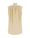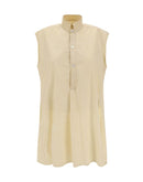 Quira’s cotton Shirt is an elegant and sophisticated garment featuring a sleeveless design and mandarin collar that add a touch of sophistication. The half-bust closure by buttons on the front adds a practical and elegant detail. The vintage effect design and side slits offer a dynamic and modern silhouette, while the monochrome pattern maintains an understated and versatile look. The oversize fit ensures comfort and a contemporary silhouette.