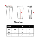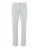 In light blue denim, no stretch, front opening with buttons, five pockets, on the back leather tag with gold contrasting logo.