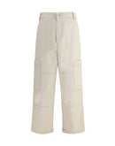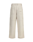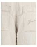 The Carré de-Nîmes cargo Jeans bring a contemporary twist to a utility classic. Crafted from soft cotton and hemp denim, they feature a high waist with engraved metal button closure and belt loops. Wide, straight legs are reinforced with stitched details at the knees, emphasizing durability and style. Oblique front pockets, applied side cargos, and laser-printed back pockets combine practicality with urban edge, while an embroidered patch on the back delivers a refined signature touch. A perfect balance between modern design and workwear heritage.