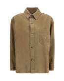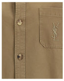 The Cassandre Overshirt in cotton and linen gabardine by Saint Laurent features a clean construction with oversized button fastening, pointed collar, and a chest pocket adorned with the Cassandre embroidery. Crafted from certified cotton, it offers a compact yet lightweight texture, complemented by adjustable cuffs and side slits for ease of movement. Subtle and refined, it captures the Maison’s signature balance between utilitarian spirit and sartorial sophistication, embodying a timeless sense of everyday elegance.