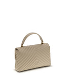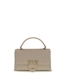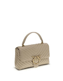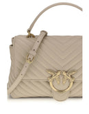 Calfskin Love Lady Handbag by Pinko, front magnetic button closure, iconic gold-plated and embossed Love Birds logo on front, quilted and padded design, double interior compartment, sliding chain shoulder strap, flat rigid handle at top, interior flat pocket with zipper, iconic tone-on-tone embroidered brand monogram on back.
