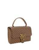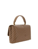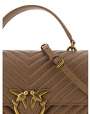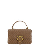 Calfskin Love Lady Handbag by Pinko, front magnetic button closure, iconic gold-plated and embossed Love Birds logo on front, quilted and padded design, double interior compartment, sliding chain shoulder strap, flat rigid handle at top, interior flat pocket with zipper, iconic tone-on-tone embroidered brand monogram on back.