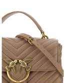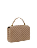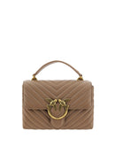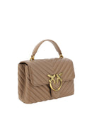 Calfskin Love Lady Mini Handbag by Pinko, front magnetic flap closure, iconic gold-plated Love Birds logo embossed on the front, quilted and padded design, double interior compartment, removable chain shoulder strap with smooth leather insert, flat rigid top handle, interior flat pocket with zipper, iconic tone-on-tone embroidered brand monogram on the back.