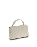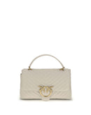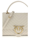 Calfskin Love Lady Handbag by Pinko, front magnetic button closure, iconic gold-plated and embossed Love Birds logo on front, quilted and padded design, double interior compartment, sliding chain shoulder strap, flat rigid handle at top, interior flat pocket with zipper, iconic tone-on-tone embroidered brand monogram on back.