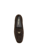 Suede Loafers by Prada are embellished with the iconic logo-embossed metal triangle on the vamp. The round toe and printed logo on the inside complete an essential yet sophisticated design. Made from high-quality materials, they combine comfort and unmistakable style, perfect for any occasion.