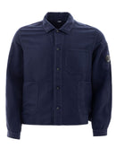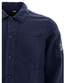 C.P. Company Linen Blend Shirt with Pockets. Blue colour, front fastening with buttons, two front patch pockets and pocket on the side, jacket model. Black logo applied on the sleeve. Composition: 51% Cotton, 49% Linen-Sku inside:24AP15