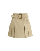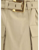 Balmain’s cargo Miniskirt reinterprets utility style with a sophisticated twist. Featuring a removable belt with a PB engraved gold metal Anthem buckle, it has two side pockets with gussets and a flap. The back closure with exposed zipper and Balmain engraved slider adds a bold iconic detail to the design.