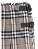 Burberry’s Check Archive Wool Miniskirt features a flared silhouette with pleats that give it movement and femininity. The waist is finished with short, thin bangs, while leather straps with a B-shaped buckle allow for tailored adjustment. The side closure is embellished with buttons and a buckle engraved with Burberry lettering, a refined detail that celebrates the brand’s distinctive elegance.