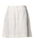 mini skirt is crafted from luxurious white floral brocade. The high-waist design enhances the silhouette, offering a refined and romantic touch perfect for sophisticated ensembles.