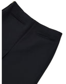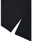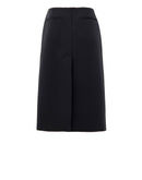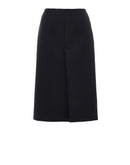 Side opening with gold hook and hidden zip, two side welt pockets, medium length. Gaucho skirt/pants model with symmetrical front/back slits.