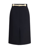 Valentino’s midi Skirt combines elegance and functionality in a refined design. Featuring a back zipper closure, it has two side welt pockets and a built-in leather belt that enhances the waist. The front slit adds a feminine and contemporary detail, perfect for a sophisticated and versatile style.