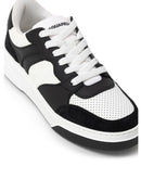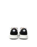 Dsquared2 Leather Bumper Sneakers. Front fastening with white laces, in white and black leather with black suede inserts on the front and back. Contrasting maple logo printed on the back, high white rubber sole and tone-on-tone Dsquared2 logo.