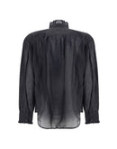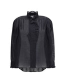 Marant Étoile’s Pamias Blouse is a garment of ethereal elegance and sophisticated design. Made of lightweight cotton voile embellished with ruffles, it offers a touch of romance and movement. It is distinguished by its asymmetrical collar and shoulder inserts, which add an element of originality to the design. The long sleeves lend an air of sophistication, while the asymmetrical hidden button placket keeps the line clean and flowing. The ruffle trim further enhances its character, and the straight cut ensures a comfortable and versatile fit, ideal for a chic, casual look.