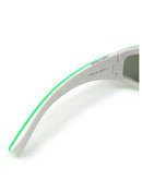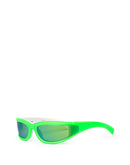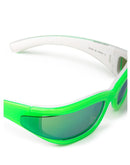 Elongated sporty frame in two-tone white/acid green, blue mirrored lenses elongated on the sides, logo printed on the temple.