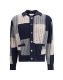 Intarsia wool Cardigan by Thom Browne, made with a fine knit combining ribbing and braiding. The design features a classic collar, front button closure and two welt patch pockets on the front. Ribbed cuffs and hem ensure a comfortable and defined fit. An iconic garment that combines traditional elegance with the brand’s distinctive design.