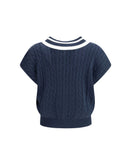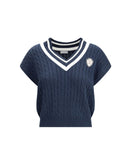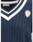 The Aran-patterned Vest by Brunello Cucinelli reinterprets classic knitwear with contemporary elegance. Crafted from cotton yarn, it features a dropped-shoulder design and a ribbed elastic belt that gently shapes the silhouette. The V-neckline, enhanced by contrasting stripes, adds a refined sporty touch, while the heraldic crest bearing the emblem of Solomeo embodies the brand’s artisanal heritage and timeless identity.