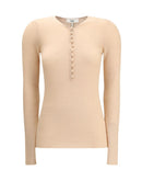 The Merino Wool Henley Sweater by Chloé brings everyday elegance to life with refined details. Rib-knit construction frames the V-neckline with fabric-covered buttons, complemented by long sleeves and a straight hem that enhance the clean silhouette. A versatile and comfortable piece, perfect for both sophisticated and relaxed looks.